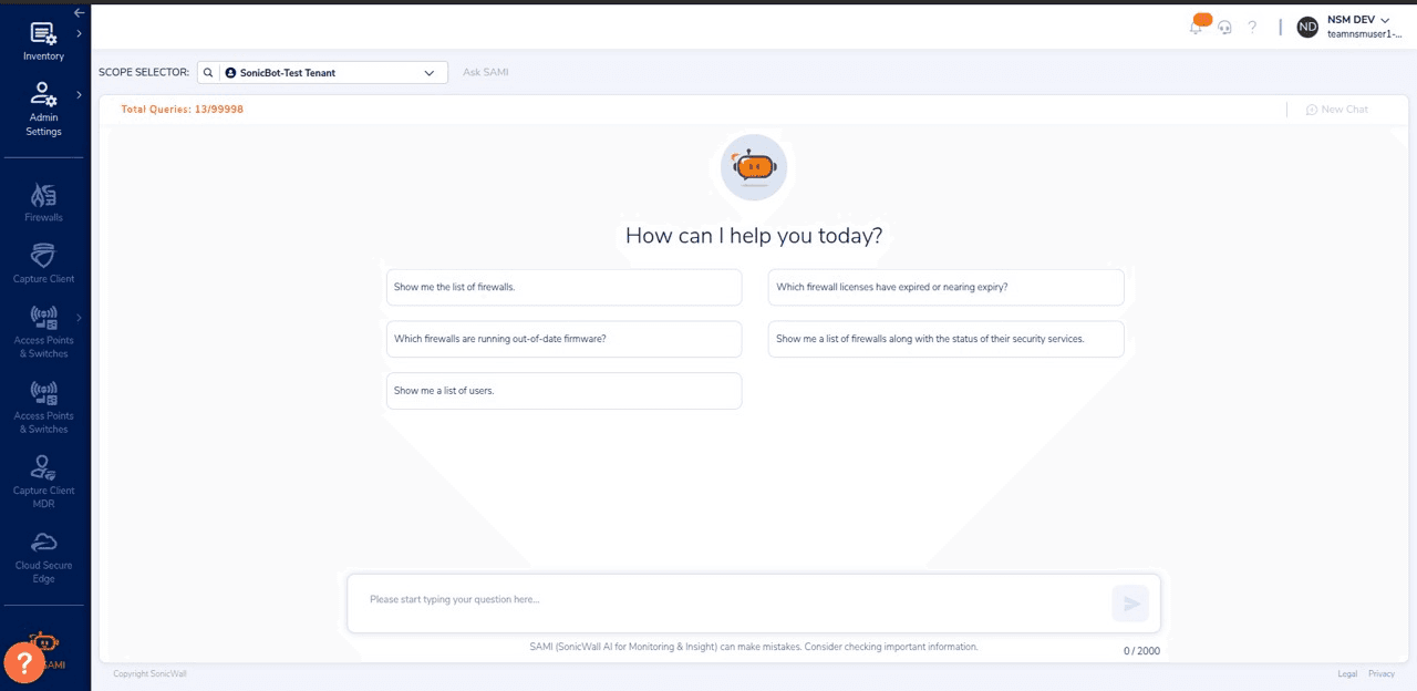 SAMI can help you streamline repetitive tasks, gain actionable insights, and implement the latest best practices, all using an intuitive, conversation-based interface. Want to know which firewalls in your environment need updates? Looking for best practice guidance? SAMI can help!