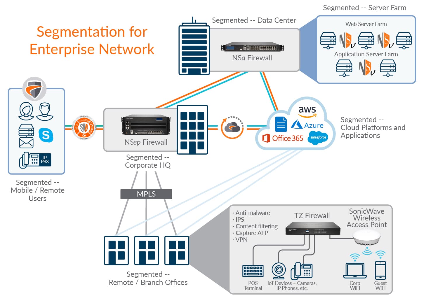 Network segmentation allows security admins to create multiple network segments, compartmentalize internal networks and provide granular secure access. SonicWall Next-Generation Firewall, Secure Mobile Access, Cloud Edge Secure Access, and Cloud App Security solutions help to segment on-premises, cloud and remote office network infrastructure for better security and controlled access. These solutions are designed to allow companies of all sizes — from small businesses to large enterprises, from the datacenter to the cloud — to segment and achieve greater protection.
