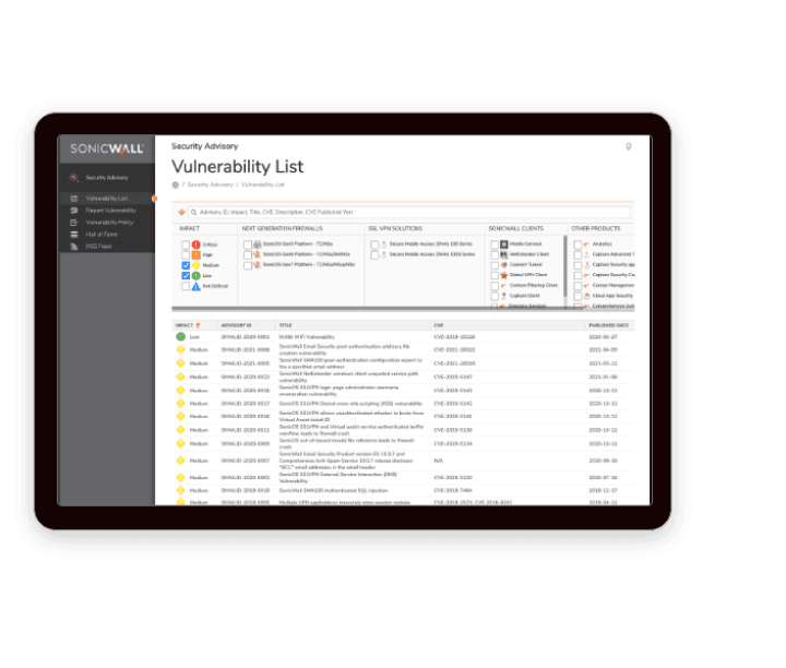 • SonicWall’s product advisory databases